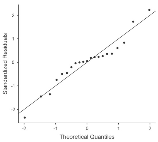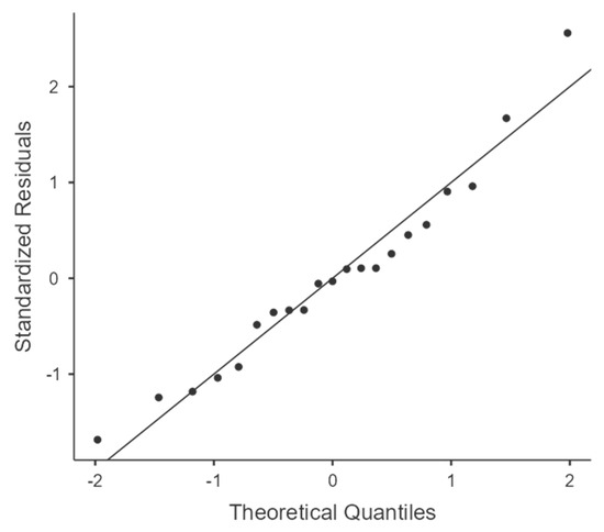 Q-Q plot of standardized residuals for SJ regression model. The Q-Q plot assessed the normality of the standardized residuals from the linear regression model for SJ height measurements (MyJump vs. Chronojump). The data points align closely with the diagonal reference line, indicating that the residuals follow an approximately normal distribution.