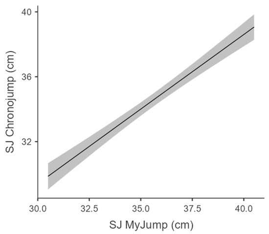 To assess the relationship between squat jump (SJ) height measurements obtained using MyJump and Chronojump, a Pearson correlation analysis was also conducted (Table 5 and Figure 4). The results indicated a strong positive correlation (r = 0.955, p < 0.001), suggesting that MyJump provided highly comparable SJ height values to Chronojump, with a 95% confidence interval of 0.891–0.982. Additionally, Spearman’s rho (ρ = 0.961, p < 0.001) confirmed this strong relationship across both measurement tools. The scatter plot with regression fit (Figure 4) visually represented the correlation between MyJump and Chronojump for SJ. The tight clustering of data points along the regression line and the narrow confidence band indicated minimal variability and high measurement consistency between the two systems. The near-perfect correlation indicated that MyJump is a reliable alternative for measuring SJ performance.