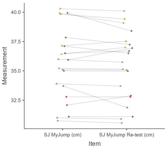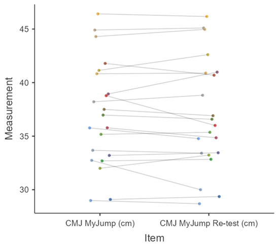 Reliability assessment of CMJ measurements using MyJump: initial vs. retest. Each color represents a unique participant and is used consistently across test and retest sessions to visually link paired observations, only for identification and not for categorical grouping.