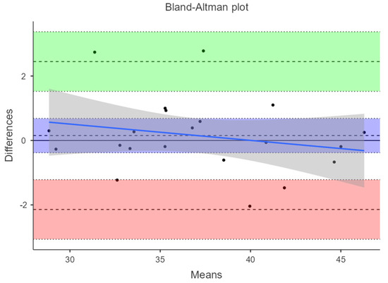 - Haghayegh, S.; Kang, H.A.; Khoshnevis, S.; Smolensky, M.H.; Diller, K.R. A Comprehensive Guideline for Bland–Altman and Intra Class Correlation Calculations to Properly Compare Two Methods of Measurement and Interpret Findings. Physiol. Meas. 2020, 41, 055012. [Google Scholar] [CrossRef]