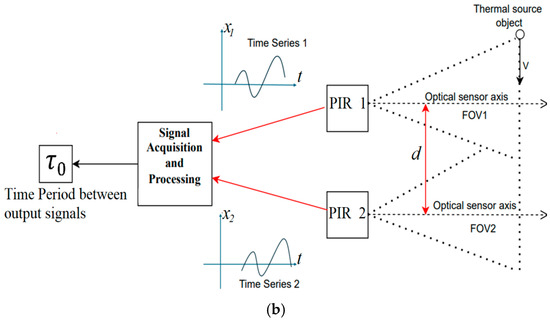 To apply the above framework to vehicle speed estimation using PIR sensors, we model the signal behavior of the sensors as a vehicle passes through their fields of view. In this study, a vehicle speed measurement is designed using two pyroelectric infrared (PIR) sensor modules placed in a known geometric configuration (Figure 2a). The system is designed to minimize centering errors by ensuring the parallel alignment between the optical axes of the sensor modules and maintaining an accurate distance d between the FOV center axes of the sensors [27,28]. As a vehicle moves past these sensors, it causes changes in the sensors’ output signals, which are then analyzed to estimate time delay between the two signals and consequently to determine the speed of the moving vehicle (Figure 2b).