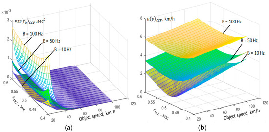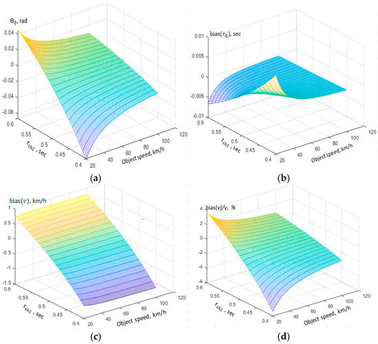 Impact of various time constant () and object speed on: (a) argument ; (b) time period estimation bias; (c) speed measurement bias; (d) relative speed measurement bias.