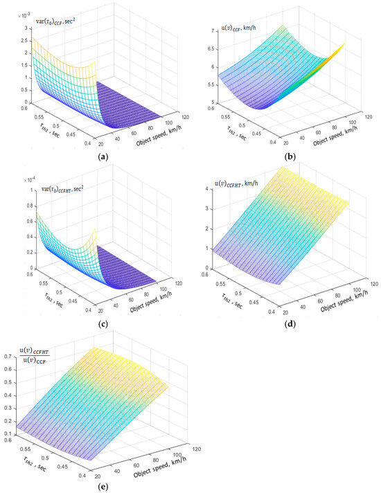 Impact of various time constant () and object speed on estimation variances, in case B = 100 Hz: (a) variance of time period estimation using CCF; (b) variance of time period estimation using CCFHT; (c) uncertainty of speed measurement using CCF; (d) uncertainty of speed measurement using CCFHT; (e) relative difference between uncertainty of speed measurement using CCF and CCFHT.
