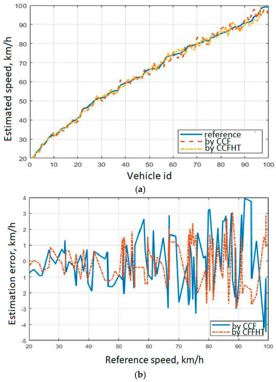 Comparison between reference vehicle speeds (obtained from video) and estimated speeds using the CCF and CCFHT methods (a); and estimation errors of vehicle speeds using the CCF and CCFHT methods under real conditions (b).