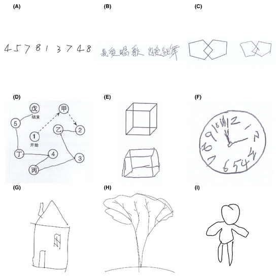 Examples of the nine cognitive and drawing assessment tasks used in this study. From left to right, (A) the P-SDMT, (B) free sentence-writing, (Chinese text: “I love singing and dancing”) (C) pentagon-copying, (D) the Trail-Making Test, (MoCA Beijing version uses Chinese sequential characters, equivalent to A-B-C-D in English version) (E) cube-copying, (F) clock drawing, (G) house drawing, (H) tree drawing, and (I) person drawing.