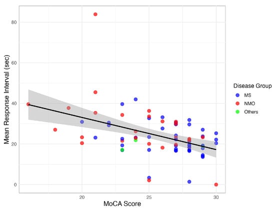 The E-SDMT response timing metrics demonstrated significant correlations with cognitive function. The mean response interval showed a strong negative correlation with the MoCA scores (, ), with the cognitively impaired (CI) patients exhibiting longer intervals (27.5 ± 14.1 s vs. 21.3 ± 6.7 s, ) and greater variability (SD: 13.6 ± 12.2 vs. 9.4 ± 4.8).