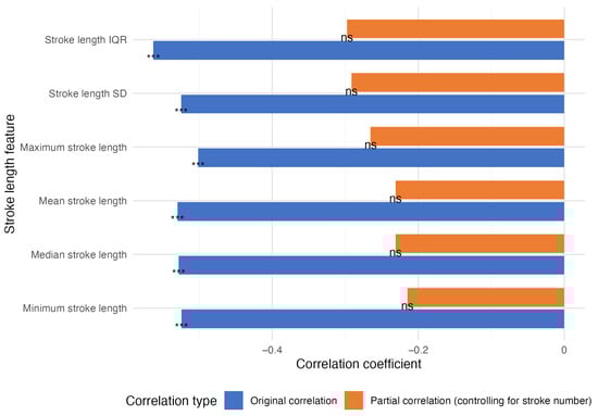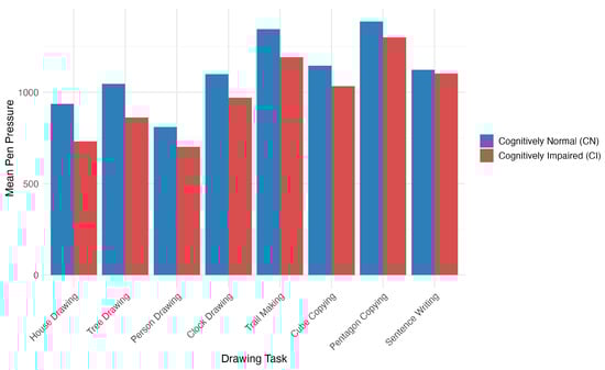 Beyond standard timing and spatial statistics, we incorporated several higher-order metrics—such as the pressure–velocity correlation, the high-pressure/high-speed ratio, the acceleration change count, and detailed pause measures—that are less commonly applied in IDD handwriting analyses [36]. Such features capture the fine-grained motor–cognitive coupling and enhance the sensitivity to early impairments.