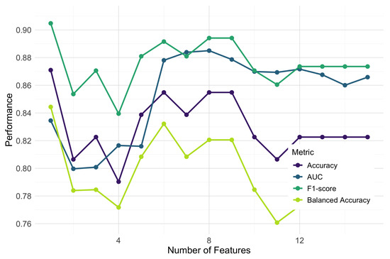 Finally, we employed an ensemble feature selection strategy integrating five complementary methods: (1) information gain; (2) recursive feature elimination with random forest (RFE); (3) Lasso regularization with cross-validated parameter tuning; (4) random forest feature importance measures; and (5) support vector machine recursive feature elimination (SVM-RFE). Features selected by at least two independent methods were designated as consensus features [41].