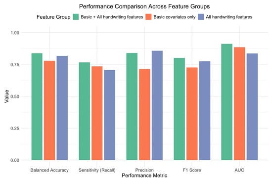 Models were trained on both the full feature set and on predefined feature subgroups to assess the independent and combined predictive value of different handwriting domains and task types.