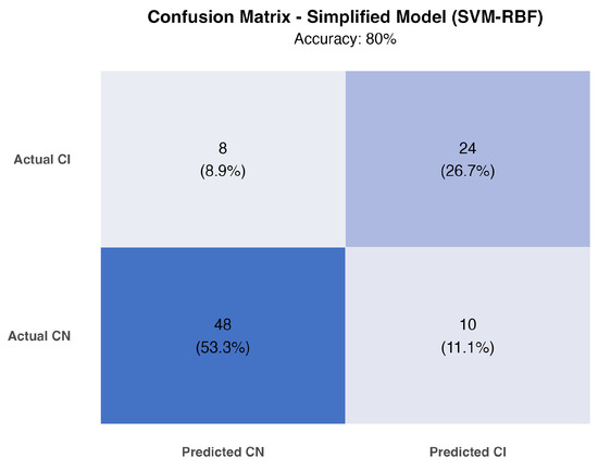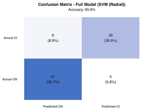 We implemented a comprehensive performance evaluation framework using 5-fold cross-validation to ensure that the performance estimates were robust to any particular train/test split. The primary evaluation metric was the area under the receiver-operating characteristic curve (AUC), which quantifies a model’s ability to discriminate between cognitively normal and impaired individuals across all classification thresholds. We also reported the accuracy, balanced accuracy, sensitivity, specificity, precision, and F1-score to provide a detailed assessment. For each metric, 95% confidence intervals were estimated through bootstrap resampling (10,000 iterations) to assess statistical robustness. Confusion matrices were examined to characterize the classification outcomes in different patient subgroups.