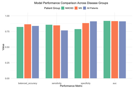To address disease heterogeneity, we adopted three complementary strategies. First, we quantified the distribution of the disease types (MS, NMOSD, and others) across the cognitive status groups and, where appropriate, included disease type as a covariate in our models. Second, we carried out subgroup analyses by disease type, developing separate classifiers for MS and NMOSD patients to identify both shared and disease-specific handwriting biomarkers. Finally, we performed sensitivity analyses by stratifying the validation folds by disease type to confirm that our findings were not driven by uneven disease distributions between cognitive groups.