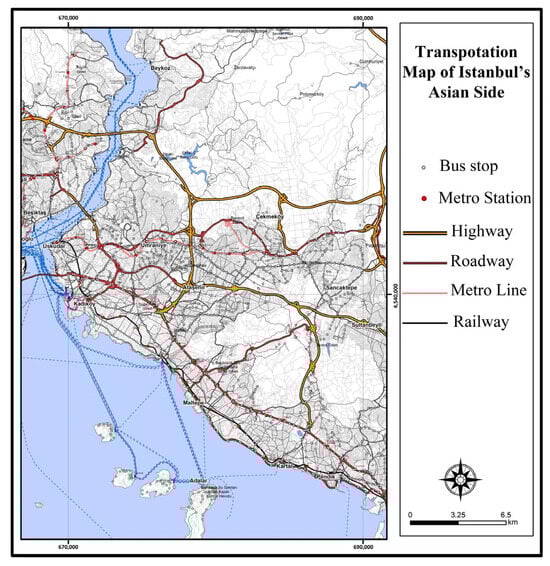 To estimate hourly bus passenger numbers, in addition to temporal data, meteorological data, as well as information concerning public holidays and school days, were used. In DL models, the correct selection of input variables is vital for the model’s success. Hence, to improve the accuracy of passenger number estimations, weather conditions for the corresponding time slots were also included in the analysis, and their effects on bus and rail systems were analyzed. In this study, two different sets of independent variables were generated. The first dataset includes time-based parameters along with public holiday and school day variables. The second dataset contains only meteorological parameters. The dependent variable (output) is the hourly passenger number for buses and rail systems. Passenger count data were retrieved from the Istanbul Metropolitan Municipality database and consist of hourly recorded boarding data throughout the year via smart card systems. The study is restricted to the Asian side of Istanbul; the transportation network map for this region is presented in Figure 1. The initial phase of the study was conducted on a regional scale, calculating the number of passengers using the bus and rail systems across the entire Asian side.