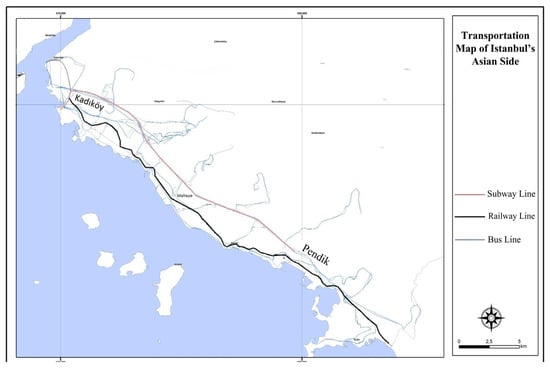 In the second phase of the study, conducted on a route-specific level, two rail lines were examined: the Kadıköy–Kartal metro and the Gebze–Üsküdar commuter line. Bus lines operating along the routes of these two rail lines were identified and incorporated into the analysis. Specifically, this approach aimed to enable a relative evaluation of bus lines sharing the same transportation corridor with the rail systems. Figure 2 visualizes the two rail lines in red and black, and the 36 bus lines overlapping with these routes are shown in blue. This map depicts the spatial coverage of the study and the geographical distribution of the transportation lines analyzed.
