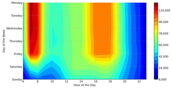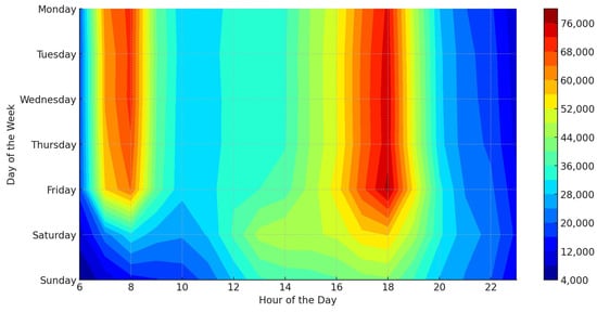 Figure 4 and Figure 5 provide contour maps visualizing the standard hourly ridership figures for bus lines and railway networks. Areas shaded in red reflect time periods with the highest passenger volumes. In both systems, passenger load clearly increases during morning hours (07:00–09:00) and evening hours (16:00–18:00). The difference in passenger density is more definite on working days, while both systems encounter a decrease in passenger numbers on weekends.