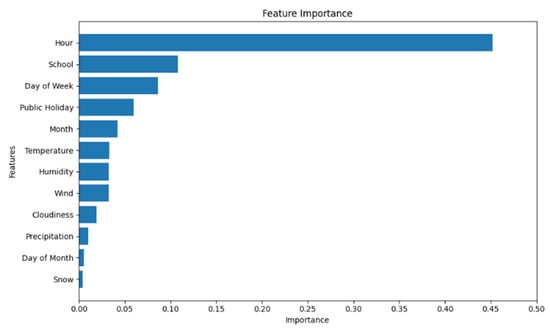 As shown in Figure 6, the hour variable appeared as the most important feature. This was followed by school days, day of the week, public holidays, and month. Among meteorological variables, humidity, temperature, and wind speed had relatively lower importance compared to time-related variables. Precipitation, snow depth, day of the month, and cloud cover were identified as features with the lowest importance. In deep learning-based approaches, improving predictive accuracy and reducing model complexity by eliminating unnecessary parameters is essential. Therefore, based on the feature importance ranking, the variables that contributed most significantly—hour, school days, day of the week, public holidays, month, humidity, temperature, and wind speed—were selected as input features for the modeling process.