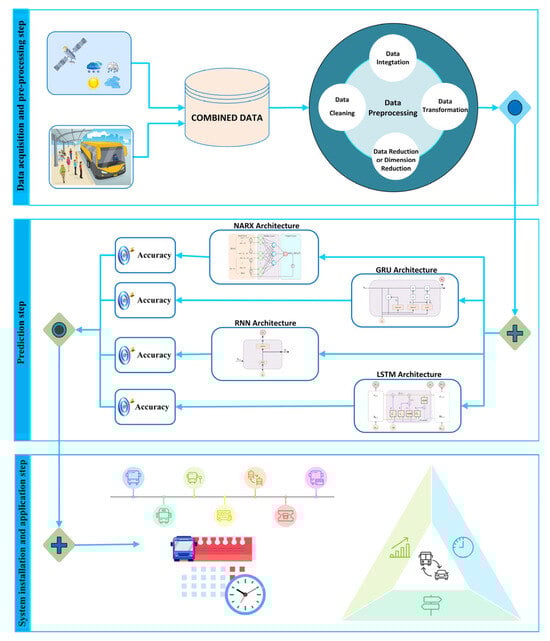 In the next phase, the LSTM model was initially used to predict passenger flow for bus and train services, based on selected parameters. Subsequently, to identify the best-performing model, three additional state-of-the-art deep learning models—RNN, GRU, and NARX—were incorporated for comparative analysis. Figure 7 displays a visual representation of the methodological framework and forecasting steps of this study.