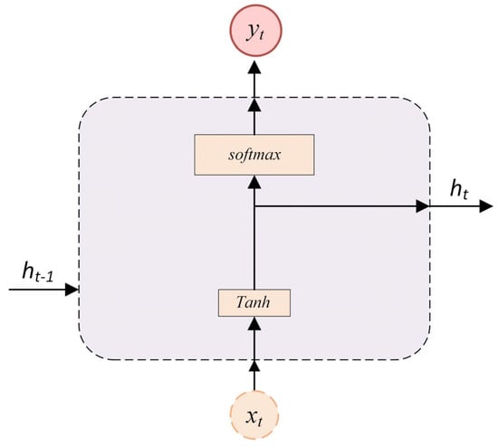 RNNs are capable of modeling short-term temporal dependencies in passenger flow prediction. RNNs generate predictions by taking into account prior input values. In Figure 8, mirrors the model input at time as is the hidden state at time with representing the predicted value for that specific time [].