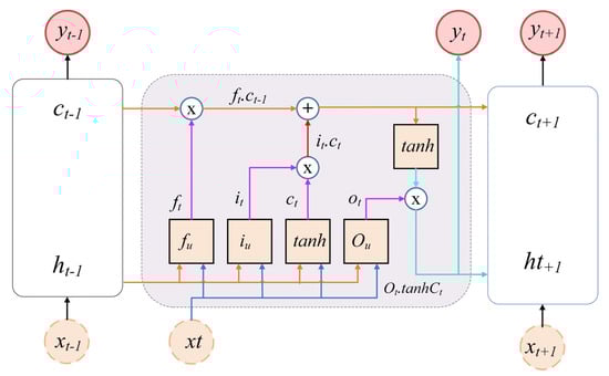 The LSTM model offers an effective solution to the vanishing gradient problem often encountered in RNNs []. As a specialized form of RNN, LSTM networks are capable of retaining relevant information over extended sequences, making them well-suited for modeling time series data. LSTMs utilize memory cells to store information and selectively update or forget it as needed. Figure 9 illustrates the architecture of a basic LSTM model [].