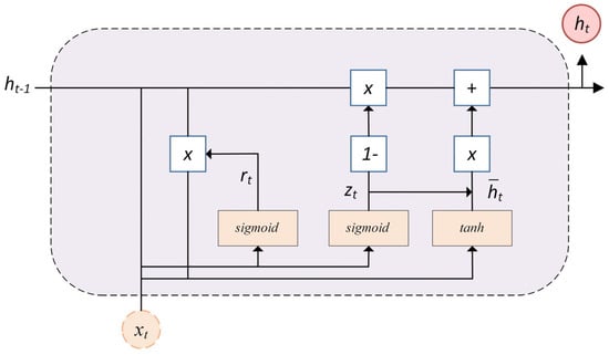 GRU offers a simpler alternative to the LSTM architecture while maintaining similar performance. As illustrated in Figure 10, a standard GRU cell features two main gates: the reset gate (), responsible for regulating the influence of the previous state, and the update gate (), which decides the extent to which past information is preserved in the current state. Additionally, based on the reset gate, a candidate hidden state () is computed, as expressed in Equation (17). The final output of the GRU cell, , is given in Equation (18). Unlike LSTM, the GRU combines the functionalities of the input and forget gates into a single update gate () [,].