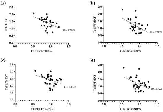 Correlation between the functional torque ratio of the knee muscles (FLE/EXTC) and the ratios calculated from the TMG parameter contraction time (Tc). (a) Correlation between FLE/EXTC at 180°/s and TcFL/TcEXT; (b) Correlation between FLE/EXTC at 180°/s and TcBF/TcEXT; (c) Correlation between FLE/EXTC at 240°/s and TcFL/TcEXT; (d) Correlation between FLE/EXTC at 240°/s and TcBF/TcEXT. The lines represent linear regression models, and the R2 values indicate the proportion of variance explained.