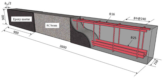 Four rectangular RC beam specimens with a cross-section of 150 mm × 300 mm and a length of 2600 mm were fabricated by considering three replacement thicknesses (10, 20, and 30 mm) to investigate their behavior; see Figure 1. The geometrical dimensions and the layout of steel reinforcements are shown in Figure 2. As shown, two 16 mm diameter bars (HRB400) and five 25 mm diameter bars (HRB400) were applied as compressive and tensile longitudinal bars of the beams. A diameter of 8 mm (HPB300) with a spacing of 240 mm was used for the stirrups, and the ratio was 0.28%; see Table 1. To prevent the reinforced beam from experiencing pure bending failure, which could occur if its shear capacity exceeded its flexural capacity, the stirrups were not configured in compliance with the minimum reinforcement ratio requirements specified in the code. The thickness of the concrete cover was 19 mm.