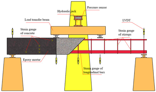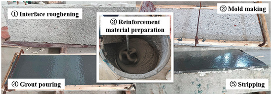 As shown in Figure 3, upon the completion of curing for the unreinforced RC beam, roughening treatment is applied to both sides of the beam. Subsequently, the formwork is set up for the pouring of epoxy mortar, and curing is performed at normal temperature for 14 days.