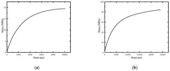 The high-toughness epoxy mortar is composed of epoxy resin, diluent, flexible curing agent, toughening agent, coupling agent, defoaming agent, fly ash, and quartz sand, mixed in specific proportions. The mix ratio of the epoxy mortar is shown in Table 2. In accordance with the requirements of DL/T 5193-2021 [36] “Technical Specifications for Epoxy Resin Mortar”, tensile tests are conducted using a “dumbbell-shaped” component, and compressive tests are performed on 40 mm × 40 mm × 40 mm samples. Strain gauges are bonded to both sides of the specimens. Stress–strain curves are then plotted based on the force and strain data collected during the tests, as shown in Figure 4. The material properties of the steel rebar used in the experiment were obtained through tensile tests. The results are shown in Table 3.