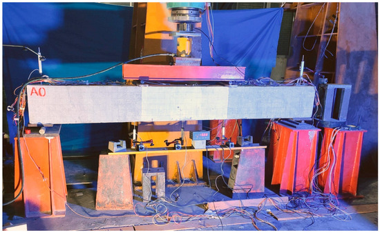 In this experiment, a 50-ton hydraulic jack was adopted to impose load on all the specimens on a reaction frame, and the loading device is depicted in Figure 5. A pre-load of 10 kN was performed before formal loading to check the instrument readings and ensure the proper functioning of the loading equipment, after which the load on the beam specimens was monotonically graded and applied by the force-controlled loading method. The loading intervals were approximately 10 kN. When the load is unable to be maintained, the displacement-controlled loading method is used, with an increment of 0.5 mm at each stage until the specimens are completely impaired, whereupon the loading is terminated. Figure 6 presents the on-site images of the specimens during the test loading process.