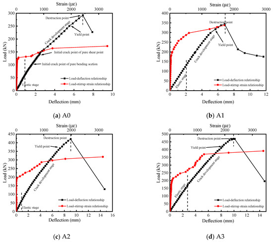 Concerning the control beam A0, when loaded to a certain value, initially, vertical cracks in the pure bending section appear on the beam; subsequently, oblique cracks arise in the shear span, and the vertical cracks cease to extend or multiply. When the load is increased to a certain value, the quantity of oblique cracks ceases to increase. At this juncture, a principal crack with a relatively large width is formed in the area where the oblique cracks are densely distributed, and the stirrups intersecting with the principal crack gradually yield. After that, the main crack continued to extend to the loading point. The failure of beam A0 belongs to shear compression failure.