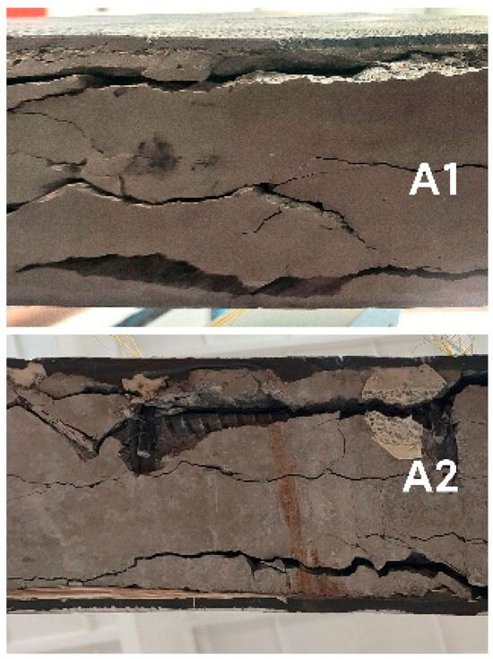In A1, obvious longitudinal cracking occurred at three positions of the tensile longitudinal reinforcement at the bottom of the beam and formed a reticular crack. The phenomena of A2 and A3 were even more pronounced. Not only did the cracks widen but the internal longitudinal reinforcement was also visible at the bottom of the shear span, as shown in Figure 8.