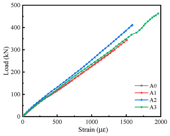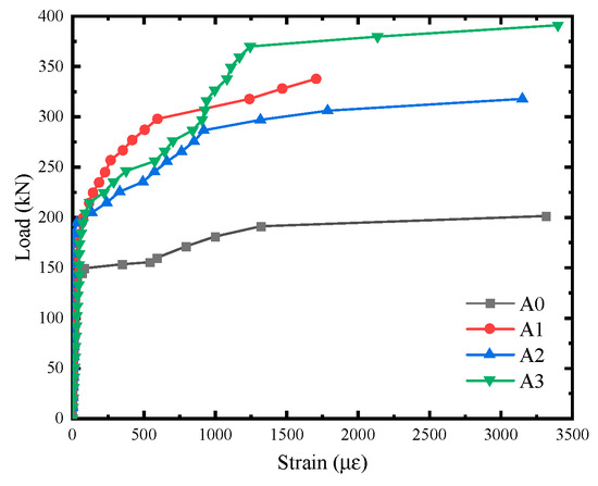 It can be discerned from the load–stirrup strain curves depicted in Figure 10 that the alteration of the stirrup is relatively minor during the initial loading stage. At this stage, no shear cracks emerge in the control beam A0, no noise is audible within the reinforced beams, and the original beam does not sustain failure. The internal forces engendered by the external load are pre-dominantly carried by the concrete and the epoxy mortar reinforcement layer.