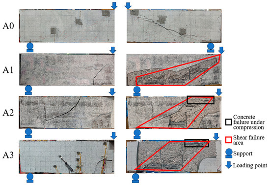 It can be seen from Figure 11 that all four test beams experienced shear compression failure. Among them, the failure of the comparative beam A0 was more inclined to shear tension failure. However, with the increase in the thickness of the reinforcement layer, the failure pattern of the internal concrete gradually tended toward web crushing failure, and the failure area gradually expanded. The top concrete near the loading point of beams A2 and A3 suffered compression failure. Therefore, it can be concluded that the epoxy mortar reinforcement layer has obviously improved the shear capacity of the beam, but the failure mode of the beam is still brittle failure. Shear failure of the strengthening layer occurred as a consequence of shear stress redistribution within the flexural shear zone, originating from the internal concrete shear damage.