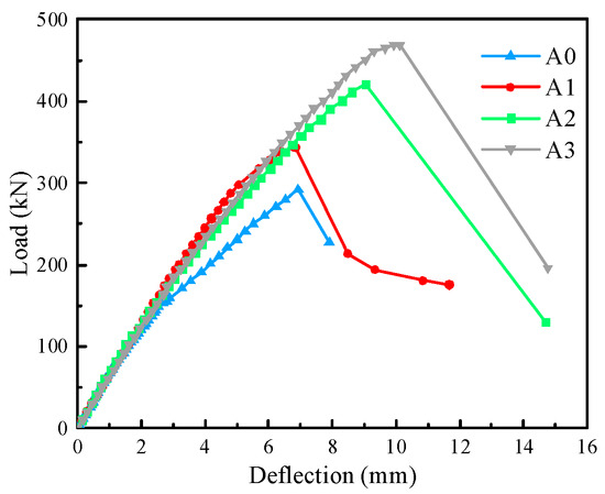 From the load–deflection curves in Figure 12, it can be seen that, before the crack emerges, the curve is basically linear, and at this time, the beam is in the elastic stage. When the crack occurs, the curvature of the load–midspan deflection curve of the reinforced beam starts to reduce. However, the curvature change in the reinforced beams is not obvious due to the high tensile strength of the epoxy mortar. With the continuous increase of the load, the stirrups start to yield, causing the growth rate of the beam’s shear capacity to slow down, while the deflection develops faster. After the beam reaches the ultimate capacity, the control beam A0 undergoes brittle shear failure, and the peak rapidly drops. Because the epoxy mortar used in the reinforced beams is also a brittle material, the peak rapidly drops to a load lower than that after the failure of contrast beam A0 after failure.