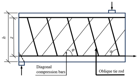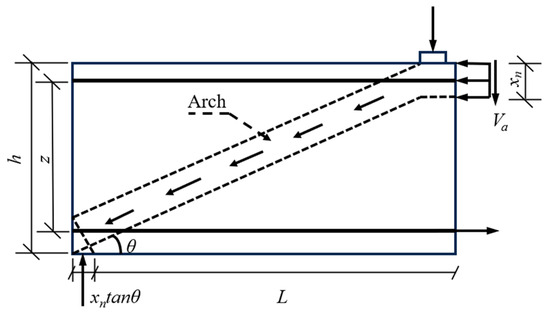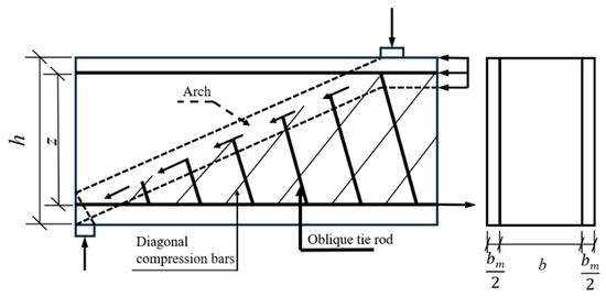 The truss-arch model, proposed by Watson et al. [40] and Ghee et al. [41], is an extension of the truss model that incorporates the arching action of concrete. Shi et al. [42] undertook a meticulous theoretical analysis of the truss-arch model and derived a calculation formula for the shear capacity based on the truss-arch model. They contrasted the calculated values with the current codes in China and the United States. The results indicate that, in comparison with the codes of the two countries, the shear capacity calculated based on the truss-arch model is in better agreement with the test values, and the truss-arch model can serve as a theoretical model for the shear failure of RC beams. The truss-arch model assumes that the shear forces in the members are shared by both the truss and arch models, meaning that the compressed concrete in the member serves as both the compression flange and the inclined compression member, as well as the arch itself, as shown in Figure 14.