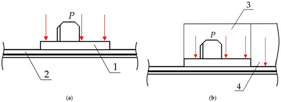 A scheme of the load (marked by red arrows) transmission from the container to the open wagon body: (a) when the container interacts with the body through fitting stops; (b) when the fitting stop interacts with the removable module. 1—a fitting stop; 2—a wagon body floor; 3—a corner fitting of the removable module; 4—a longitudinal beam of the removable module.