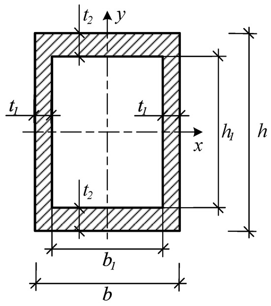 The calculations show that from ensuring the strength of the removable module point of view, it is advisable to use a pipe with dimensions of a cross-section 30 × 30 × 5 and a moment of resistance of the cross-section W = 561.13 cm3. In order to reduce the container of the removable module, the parameters of its profile were optimized. A cross-section of the beam of the removable module frame is shown in Figure 4.