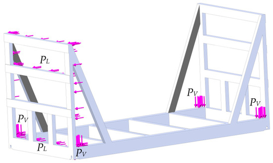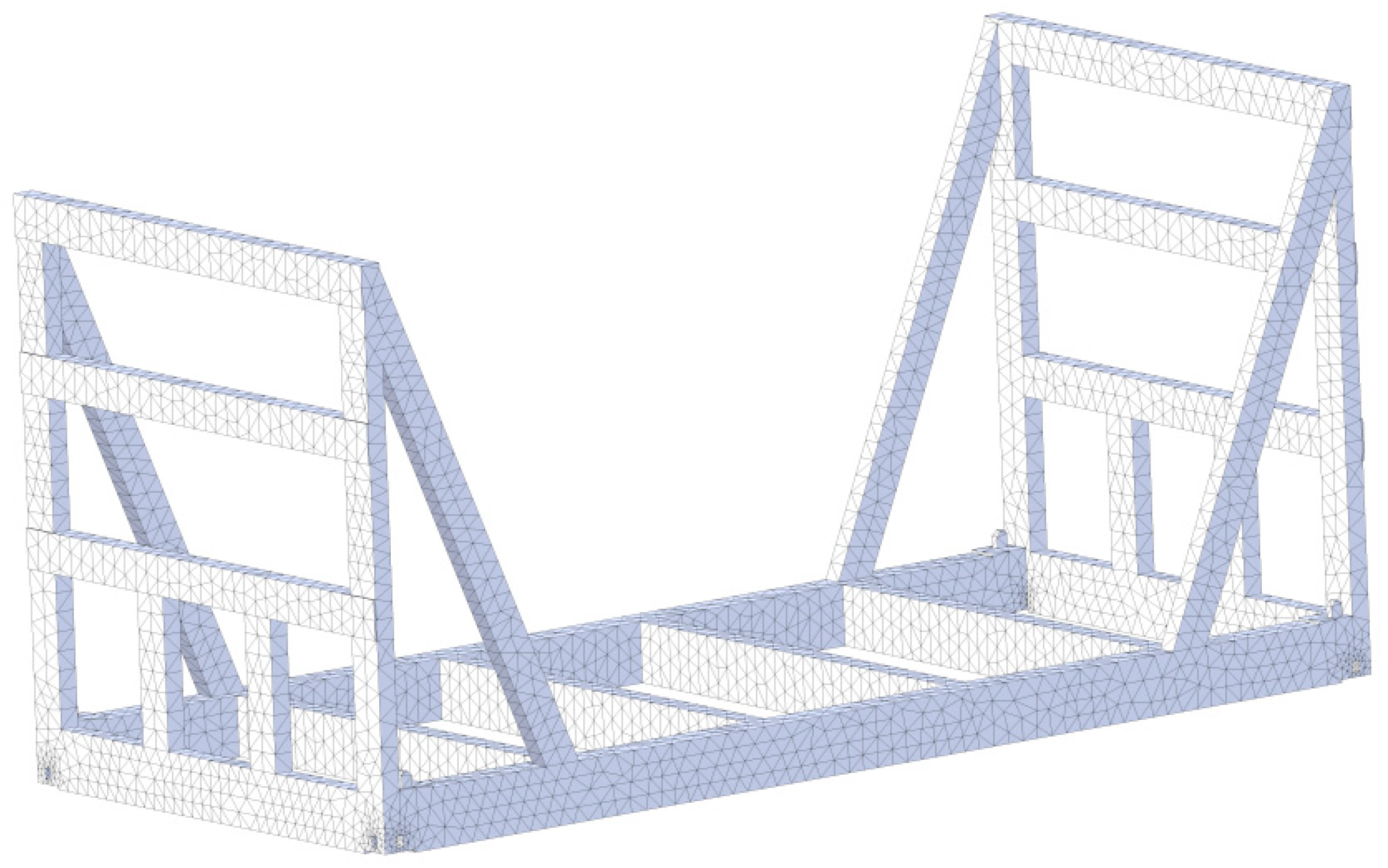 Considering the determined parameters of the frame profile, its spatial model was built, and its strength was calculated. When calculating the strength, the finite element method was used, which was implemented in SolidWorks Simulation 2018. When creating the model, the welds between the individual components of the frame were not considered. The finite element model of the frame was formed by tetrahedra elements, and it is depicted in Figure 8, since the finite element mesh was created on a solid body [46,47,48,49,50]. The number of tetrahedra that formed the mesh was calculated graphically. Taking this into account, the number of nodes was 40,688, and the number of elements was 110,331. The largest element had a size of 100 mm, and the smallest element had a size of 20 mm. The calculation was implemented for two load schemes of the removable module: