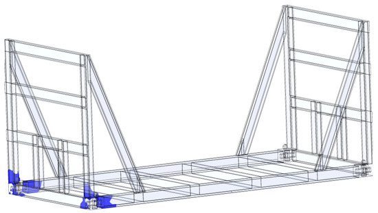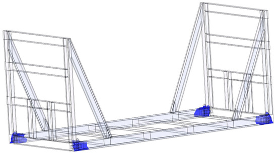 The justification of such a container fastening scheme is given in a previous publication by us [46]. Based on the previous studies, the use of rectangular pipes as the profile of the removable module was proposed. This is explained by the manufacturability of the module’s manufacturing and maintenance, as well as the possibility of further use of fillers in the module components to reduce its load in operation.