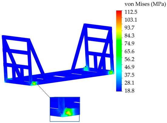 The maximum stress that arose in these zones was 112.5 MPa (Figure 12), which is lower than the permissible ones for steel grade 09G2S, which are 310.5 MPa.