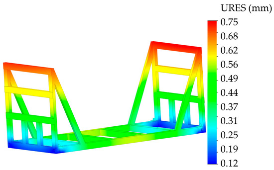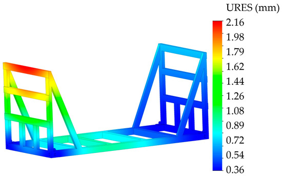 Maximum displacements occur in the upper parts of the module structure, and they are about 1 mm (Figure 13).