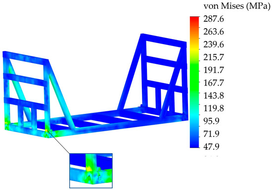The maximum stress that arose in these zones was 287.6 MPa (Figure 15). These values are lower by 7.4% than the permissible ones.