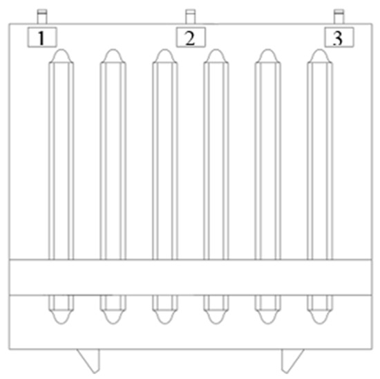 An arrangement of groups of strain gauges on the hatch cover: 1—the first group; 2—the second group; 3—the third group.