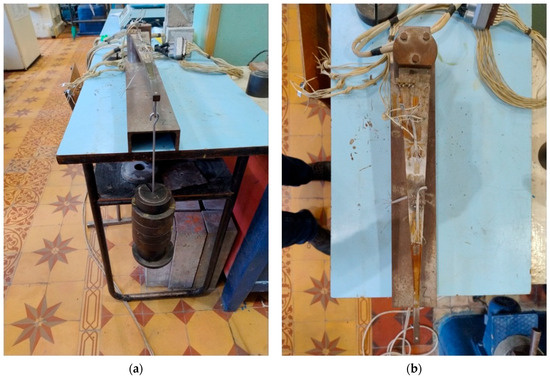 Strain gauge calibration: (a) the beam load; (b) a placement of strain gauges on the beam.