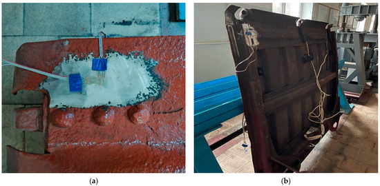 A placement of strain gauges on the hatch cover: (a) a top view (in the hinge area); (b) a bottom view.