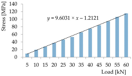 It can be seen from Figure 22 that the dependence of relative deformations on the load is linear. The stresses that arose in the hatch cover are given in Table 4 and also in Figure 23.