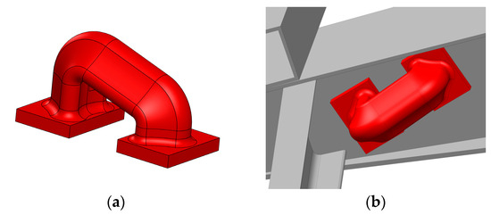 In this case, we plan to install fitting stops on the floor of the open wagon body floor, which will ensure the module fixing on the wagon body (Figure 2). The corner fittings of the removable module have a recess that ensures the transmission of the vertical load (marked by red arrows) to the wagon body floor through the entire area of the removable module’s contact with it (Figure 3). The vertical load is further transmitted to a wagon bogie [44,45].