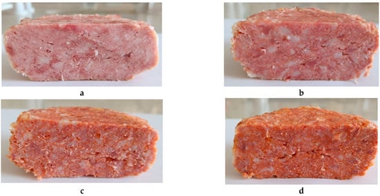 For the production of canned pork, pork jowl and shoulder from a slaughterhouse (Meat Plant Wasąg) were used and processed 48 h after slaughter. The meat was first minced manually and then finely ground using a KU2-3E machine (Mesko-AGD, Skarżysko-Kamienna, Poland) with a mesh with a hole diameter of 5 mm. The obtained meat was divided into four groups: control and three groups with the addition of various amounts of tomato peels and seeds powder (TPSP). The research material consisted of a single variety of tomato (Solanum lycopersicum L.) purchased from a local supermarket. The tomatoes were washed and then pressed using a kitchen press to obtain tomato pomace (tomato peels and seeds). The pomace of this vegetable was freeze-dried using a freeze dryer (Labconco Free-Zone, Kansas City, MO, USA) at the temperature −50 °C and a vacuum pressure of 0.04 mbar for 48 h. The dried material was then ground in a laboratory mill with a diameter of less than 0.3 mm. Freeze-dried TPSP was characterized by antioxidant properties ranging from 0.112 mg Trolox eqv. g−1 in studies with the ABTS•+ radical to 0.120 mg Trolox eqv. g−1 in studies with the DPPH• radical. The average total phenolic content (TPC) of pomace was 4.080 mg gallic acid eqv. g−1 [22]. The content of bioactive components, including lycopene and beta-carotene, determined in freeze-dried tomato pomace was 0.74 mg/100 g and 0.68 mg/100 g, respectively. The recipe of each variant included 20% jowl, 80% shoulder, 2% salt, 5% water and sodium(III) nitrite in the amount of 50 mg/kg. The meat and additives were thoroughly mixed in a KU2-3E machine (Mesko-AGD, Skarżysko-Kamienna, Poland). Then, the meat stuffing was then placed in aluminum cans with a capacity of 300 mL and sterilized on a vertical steam sterilizer (AS2, SMS, Góra Kalwaria, Poland). The experimental samples were heated at 121 °C, assuming that their degree of heating was achieved as measured with the sterilization value (F ≈ 4 min) determined using the formula: