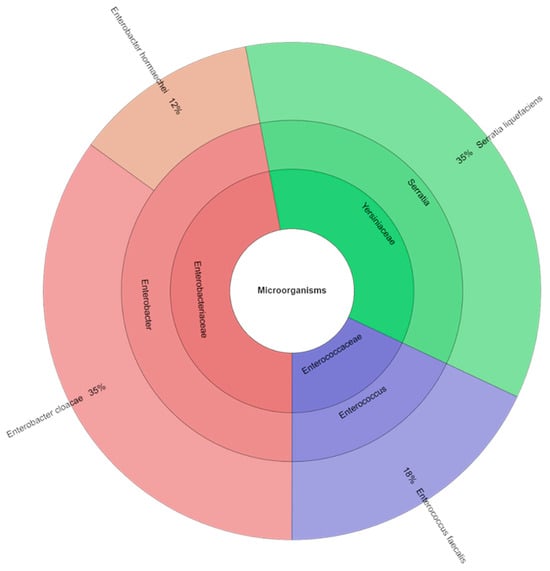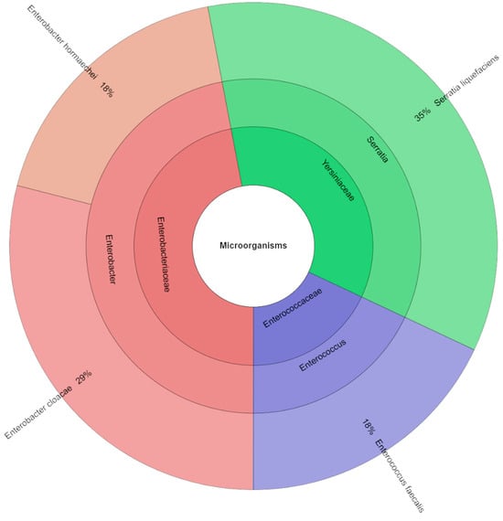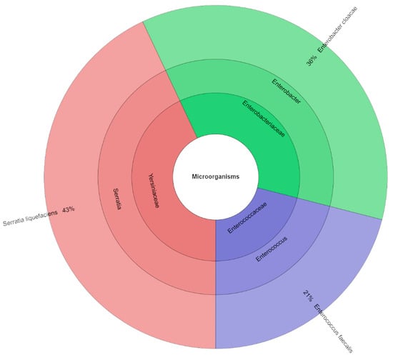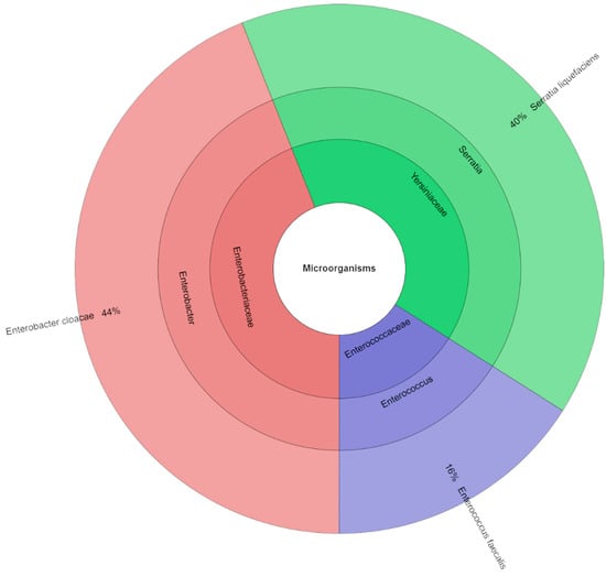 A total of 81 isolates were identified using mass spectrometry (Figure 2). Four species, three genera, and three families were identified in the control samples of canned pork. The Yersiniaceae and Enterobacteriaceae families were the most commonly isolated. Enterobacter cloacae and Serratia liquefaciens were the most abundant species (35%), followed by Enterococcus faecalis (18%) and Enterobacter hormaechei (12%).