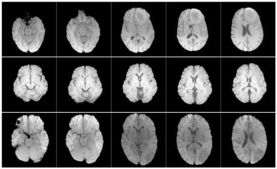 Axial T1w pre-contrast MRI slices from the RSNA-MICCAI data set. Each row shows a different patient, and each column shows a different slice from the same scan.