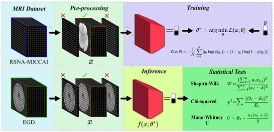 Diagram illustrating the proposed method for CNN training and inference. The RSNA-MICCAI data set (top) was used for training on skull-stripped T1w MRI data, while the EGD data set (bottom) was used for inference on full-head scans. The pipeline includes preprocessing, model training, prediction, and statistical analysis. Statistical tests include the Shapiro–Wilk test (W) for normality, the Mann–Whitney U test (U) for median comparison, and the chi-squared test () for categorical distributions. These tests were used to evaluate potential demographic biases in model predictions.